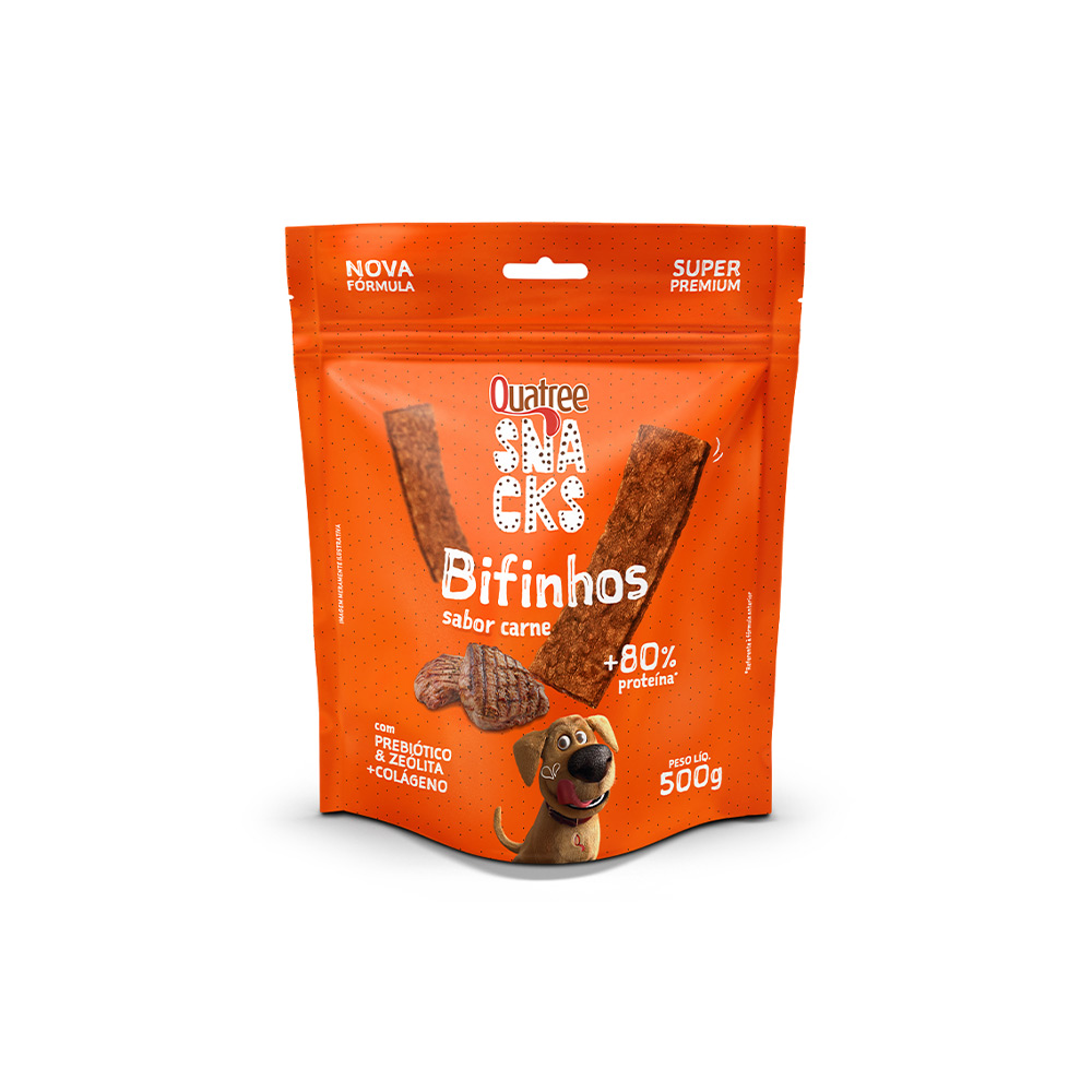 Quatree Snacks Bifinhos é uma delícia de petisco feito com ingredientes especiais que o seu cão vai adorar! Saboroso e nutritivo, é indicado para cães de todas as idades. Quatree Snacks Bifinhos contém prebiótico e zeólita para auxiliar no equilíbrio da flora intestinal, colágeno para manter a pele saudável e macia e hexametafosfato de sódio para reduzir a formação de tártaro e mau hálito. Quatree Snacks Bifinhos alimenta e faz a alegria do seu cão!